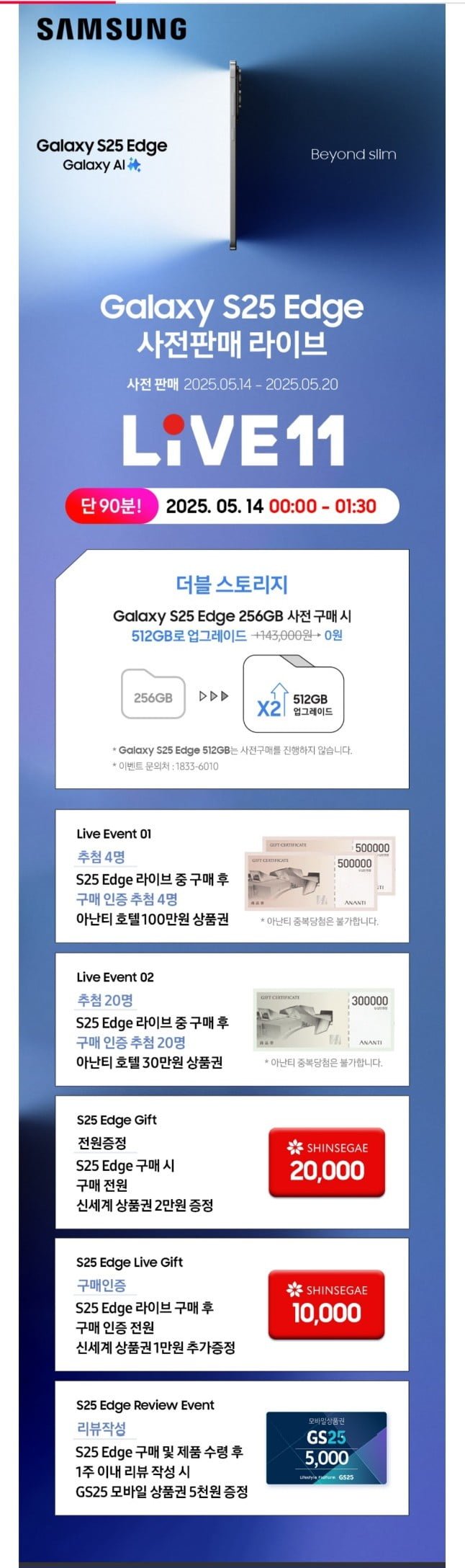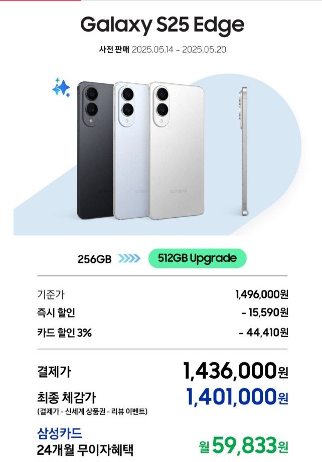 [11번가]삼성전자 갤럭시s25 엣지 256->512gb 업 ,증정 3.5만신세계 (1,436,000원/무료)