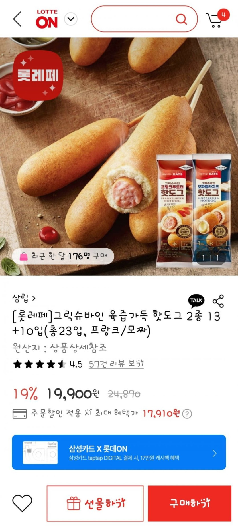 [롯데온]롯레페/그릭슈바인 육즙가득 핫도그 2종 13+10입(총23입, 프랑크/모짜)(토스결제시 17,910원/무배)