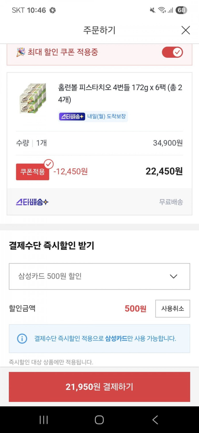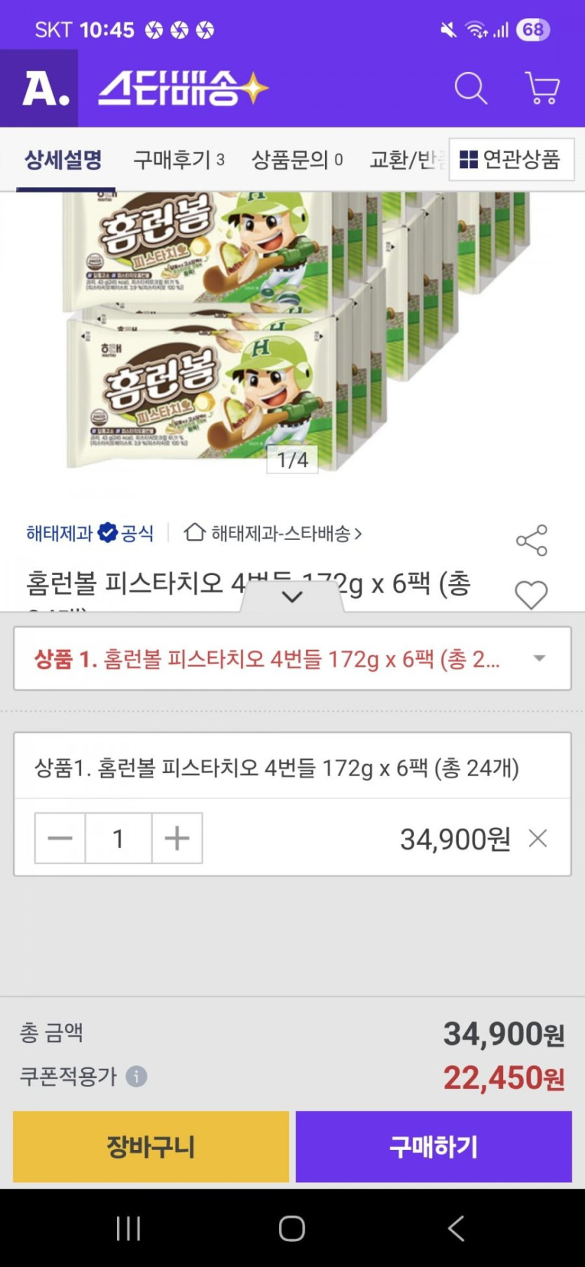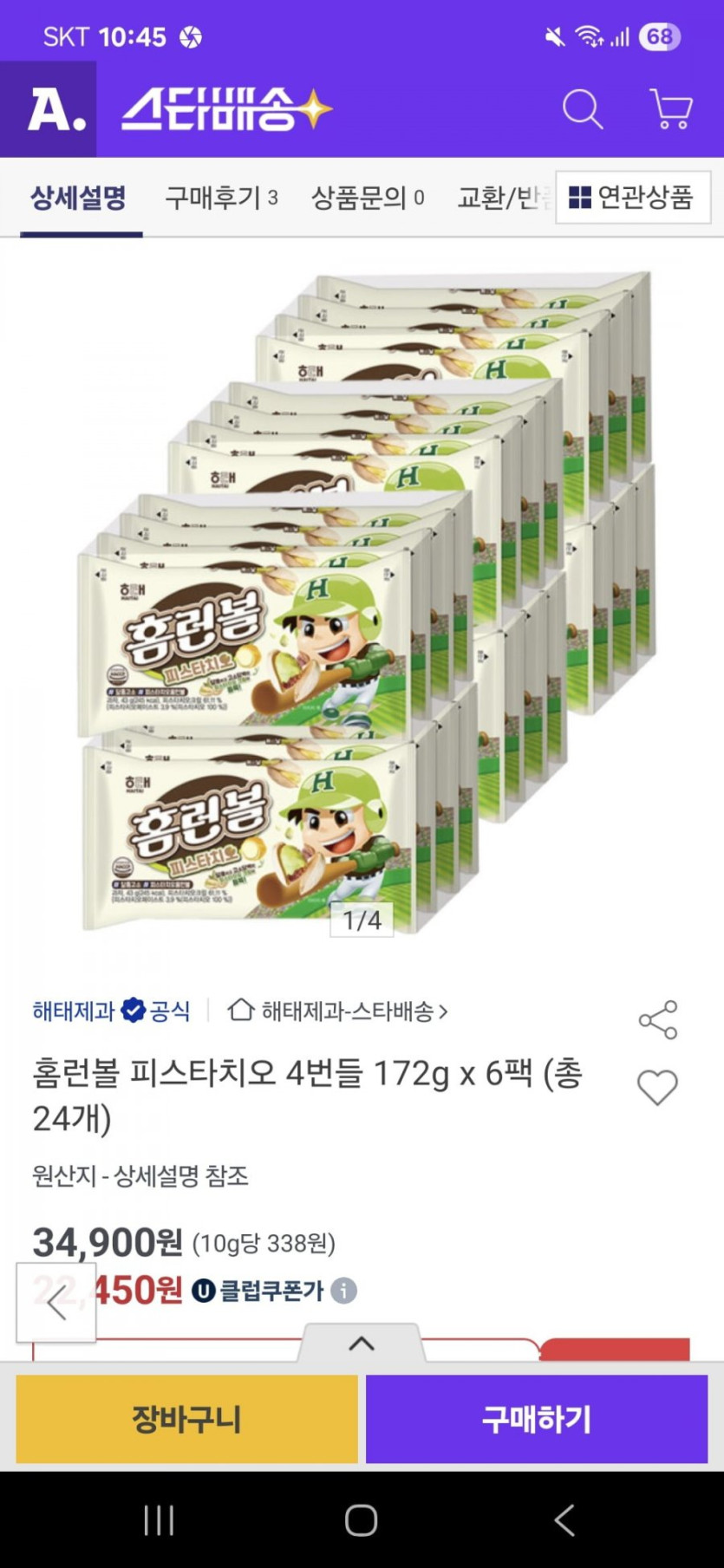 [옥션]유클가. 해태 홈런볼 피스타치오맛 43G 24통(유클 쿠폰, 삼성카드가 21,950원/유클 무료배송)