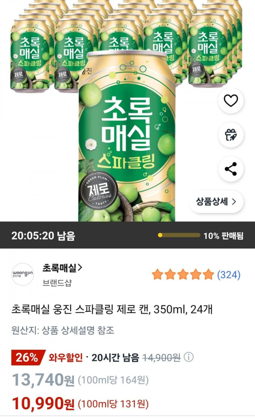 [쿠팡]초록매실 웅진 스파클링 제로 캔, 350ml, 24개 (13,740원/무료)