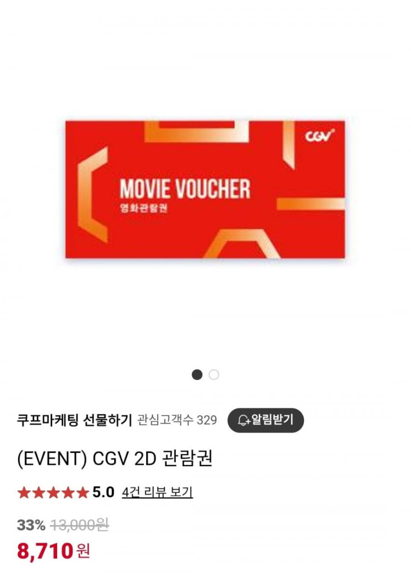 [네이버]CGV 관람권 (8,710원/무료) 작성자 정보 초코 작성 작성일 2025.06.22 12:11 컨텐츠 정보 25 조회 목록 본문 씨지브이 영화관 갈분들은 참고하세요 https://m.smartstore.naver.com/coop_egift/products/11923700639 관련자료 이전 [11번가]장용성 RTG 오메가3 4개월분 (22,690원/무료) 작성일 2025.06.22 12:15 다음 [네이버]복앤돈 수입삼겹살 500g (원산지:독일) (5,490/3,500) 작성일 2025.06.22 12:08 댓글 0 등록된 댓글이 없습니다. 로그인한 회원만 댓글 등록이 가능합니다. 목록
