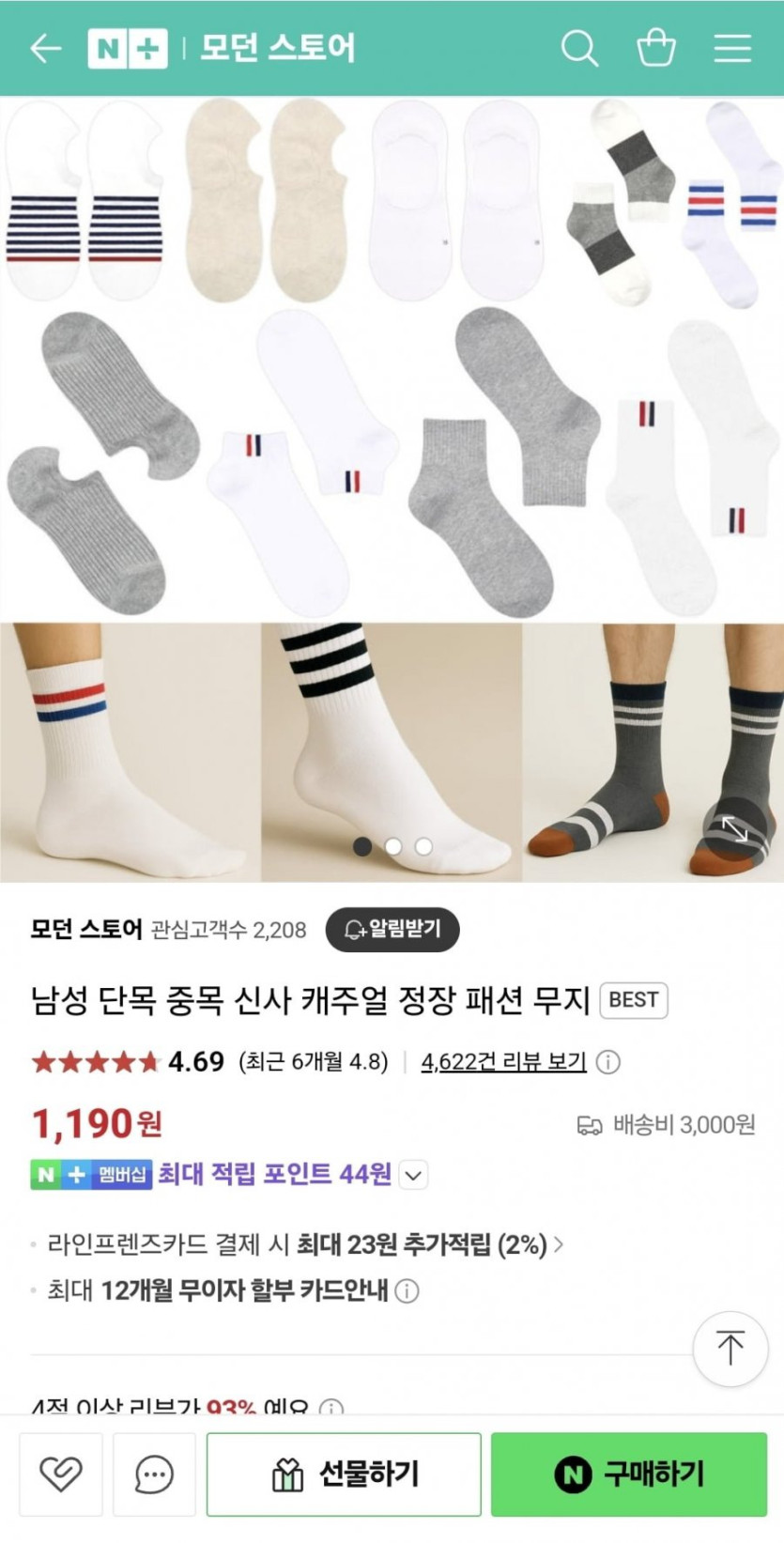 [네이버]남자 국산 양말 단목 중목 (1,190원/3,000원)