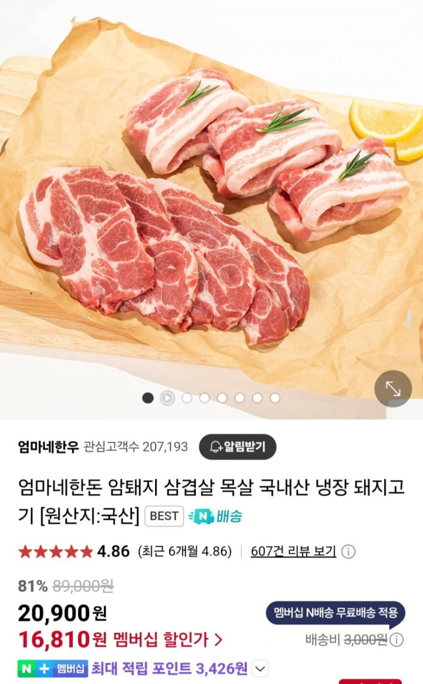 1등급 이상 중에서 맛있는 부위로 선별한 한돈이고 네이버멤버십 있으면 무료배송 가능합니다