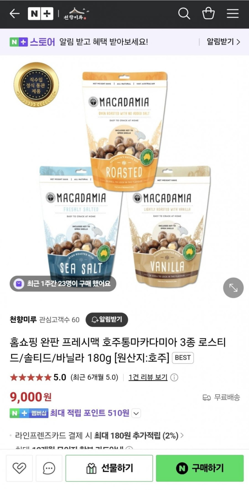 [네이버]프레시맥 호주 통 마카다미아180g (9,000원/무료)