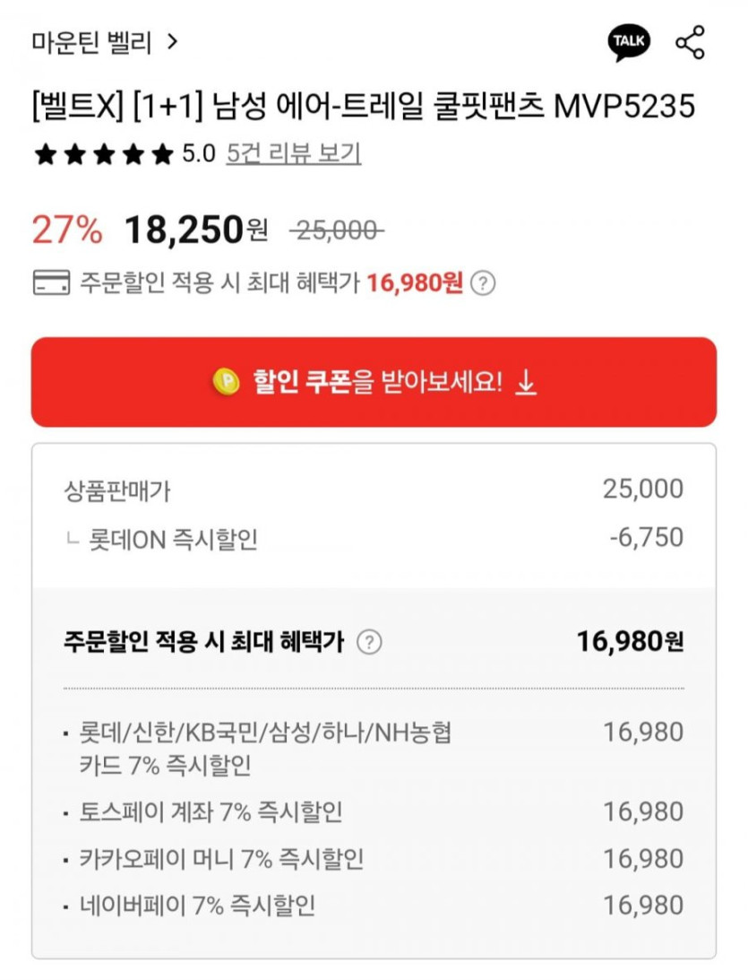 쿨핏 팬츠 1+1 가격이고 카드할인까지 받으면 16980원까지 가격 내려갑니다