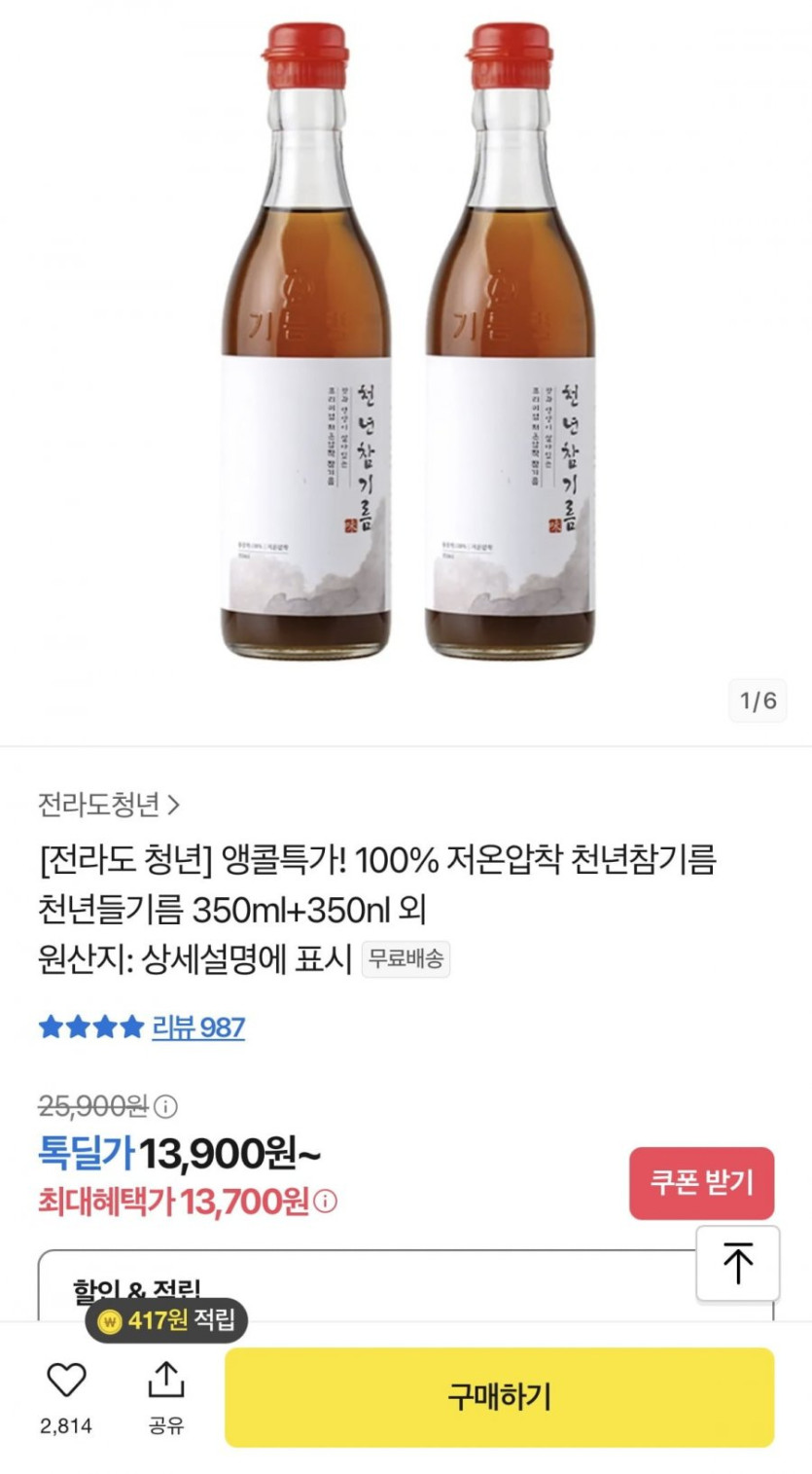 [톡딜]저온압착 천년참기름 350ml 2병 (13,700원/무료)