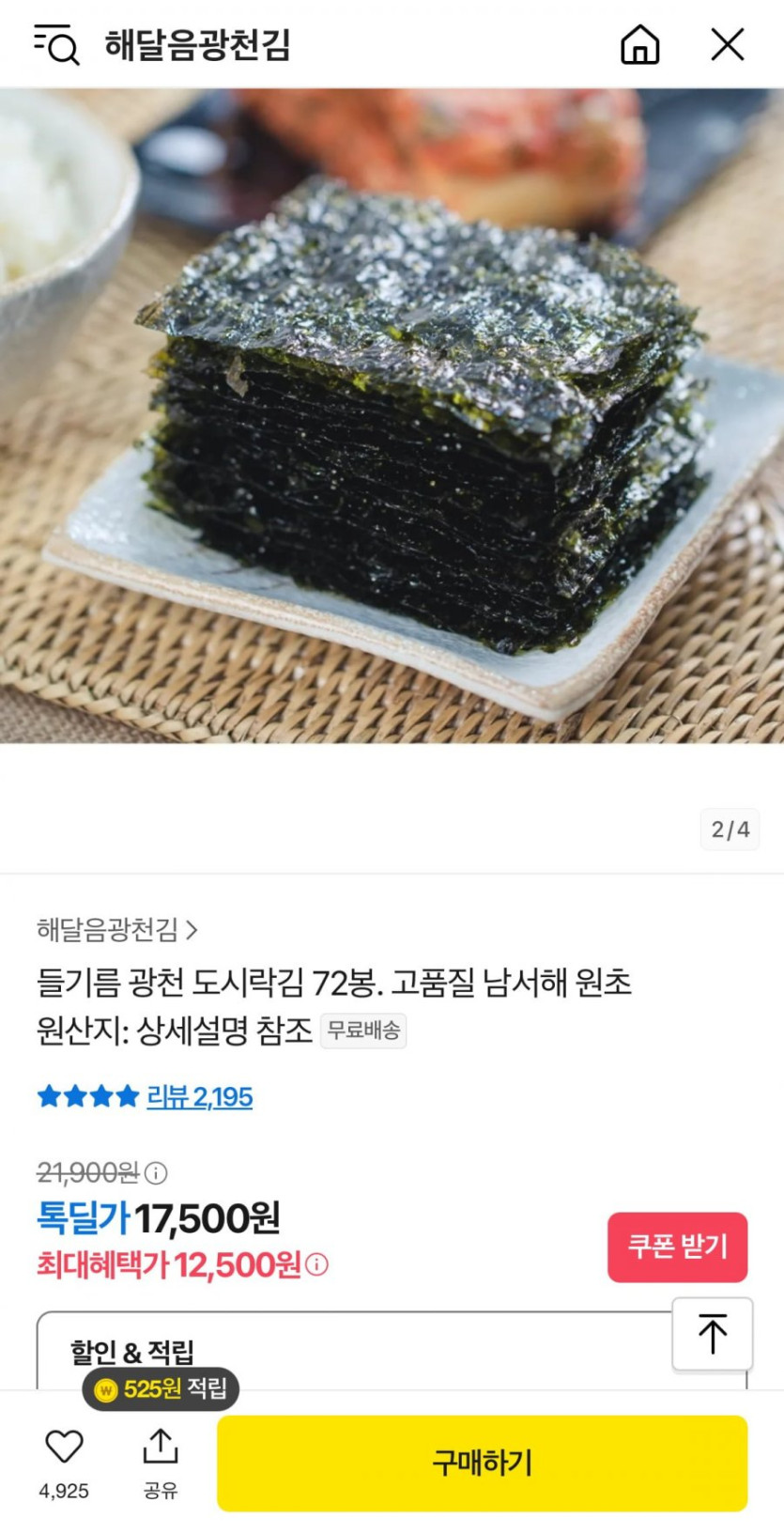 [톡딜]들기름 광천 도시락김 72봉 (17,500원/무배)