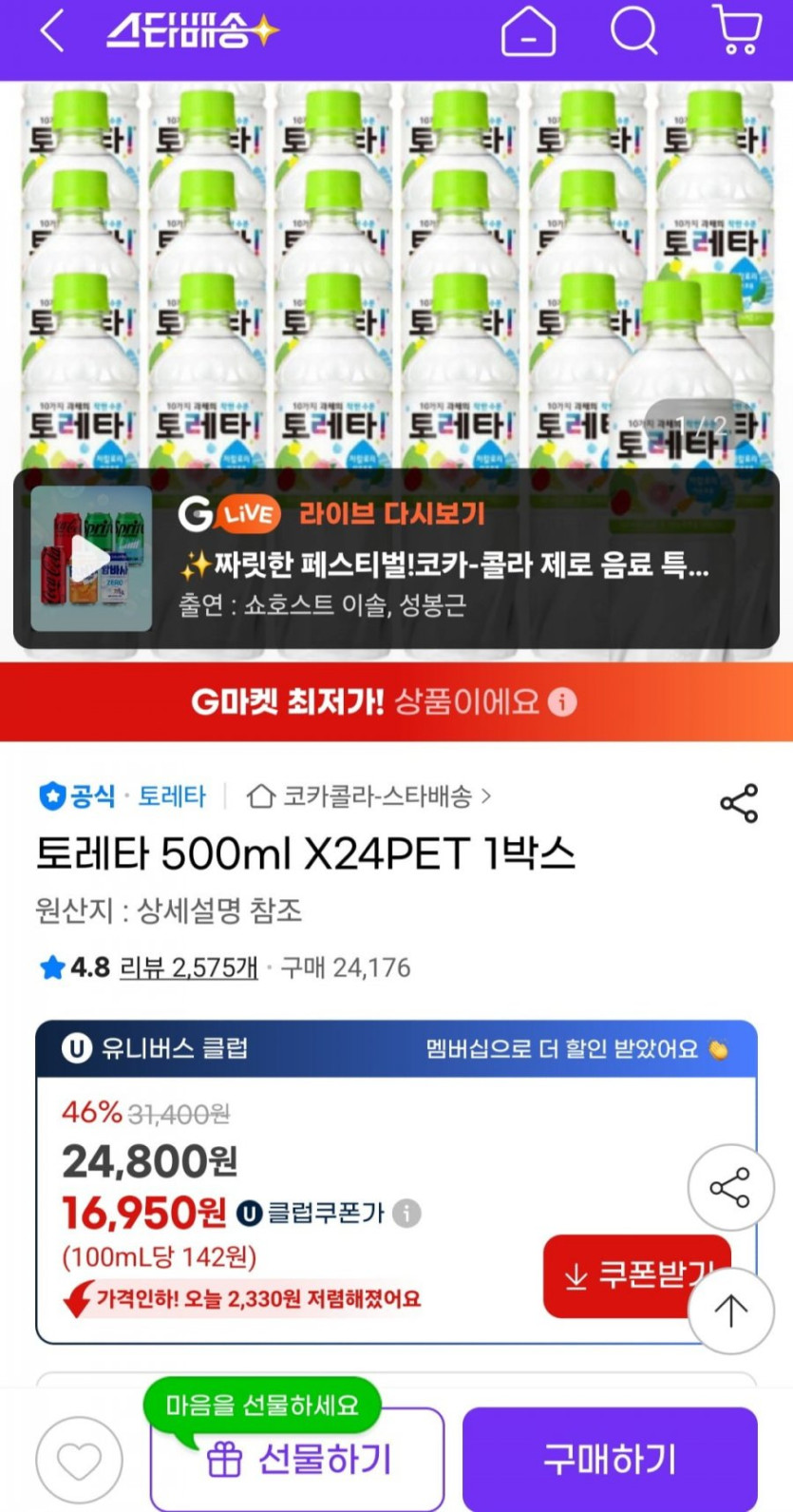 [지마켓]토레타 500ml 24PET 1박스 유클회원 (16,950원/무료)