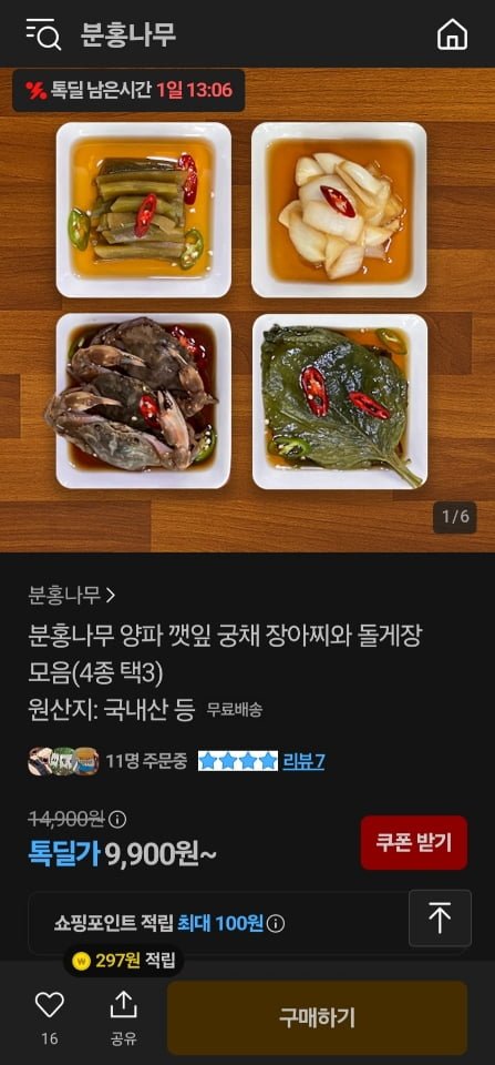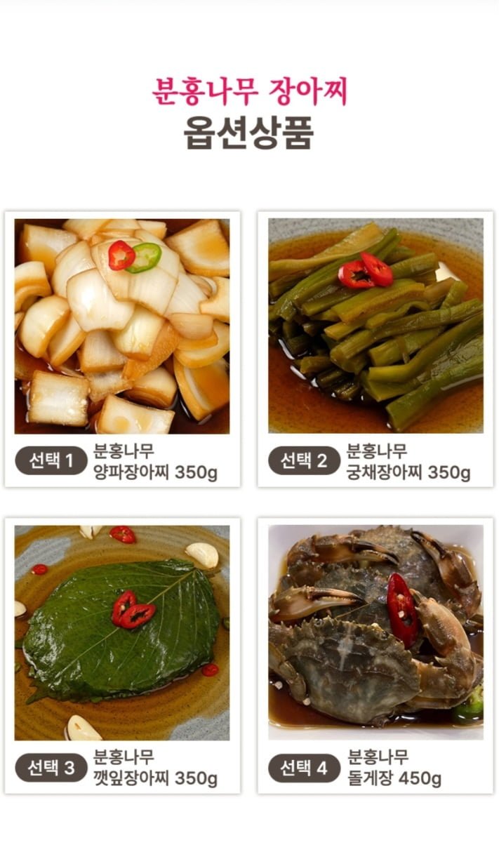 [톡딜]분홍나무 장아찌 양파/깻잎/궁채/돌게장 모음 4종 택3 (9,900원~/무료)