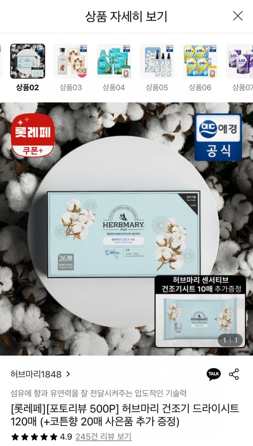 [롯데온]허브마리 건조기 드라이시트 120매+코튼향 20매 (12,070원/무료)