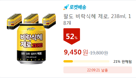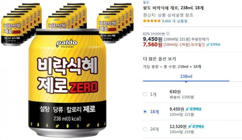 [쿠팡]팔도 비락식혜 제로 238ml 18개 (7,560원/와우무료)