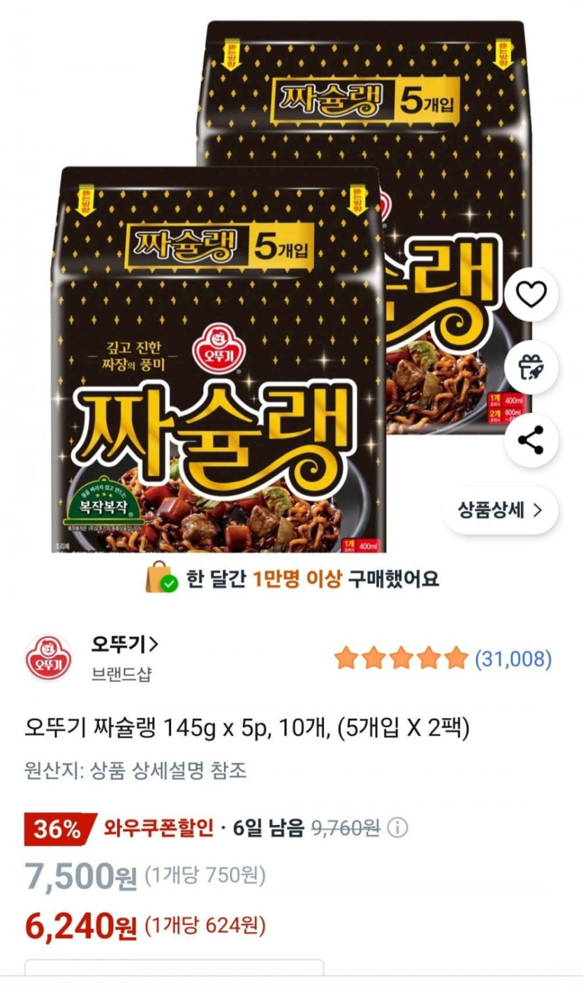 [쿠팡]오뚜기 짜슐랭 145g x 5p 10개 (6,240원/무료)