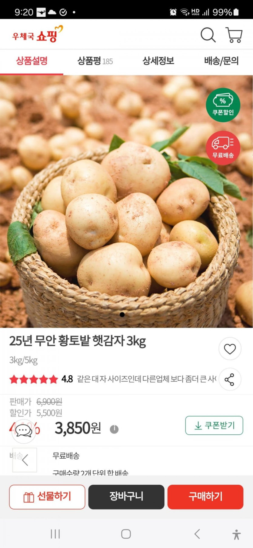 [우체국쇼핑]25년무안황토밭햇감자 3kg 중 (3,850원/무배)