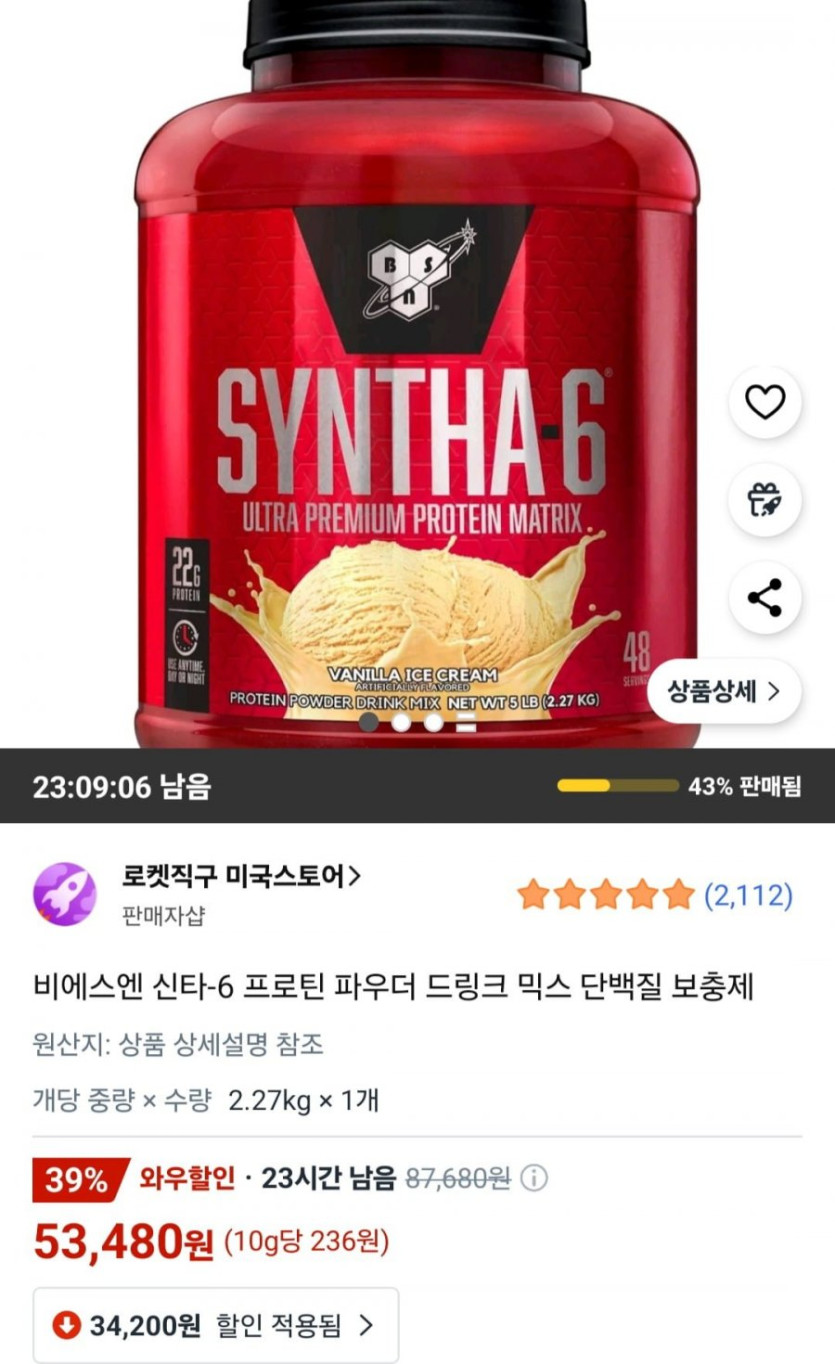 [쿠팡]비에스엔 신타-6 프로틴 파우더 드링크 믹스 단백질 보충제 (와우 53,480원/무료)