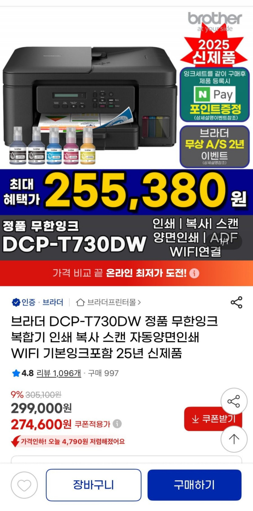 [지마켓]브라더 DCP-T730DW 정품 무한잉크복합기 [255,380/무배]