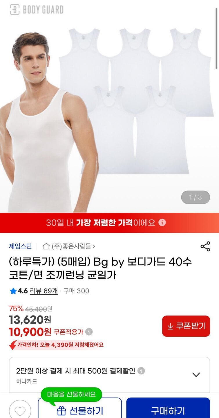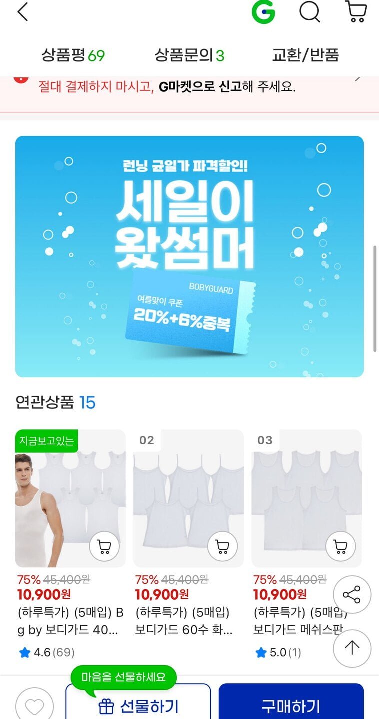 [지마켓]보디가드 40수 조끼런닝 균일가 5매입 (10,900원/무료)
