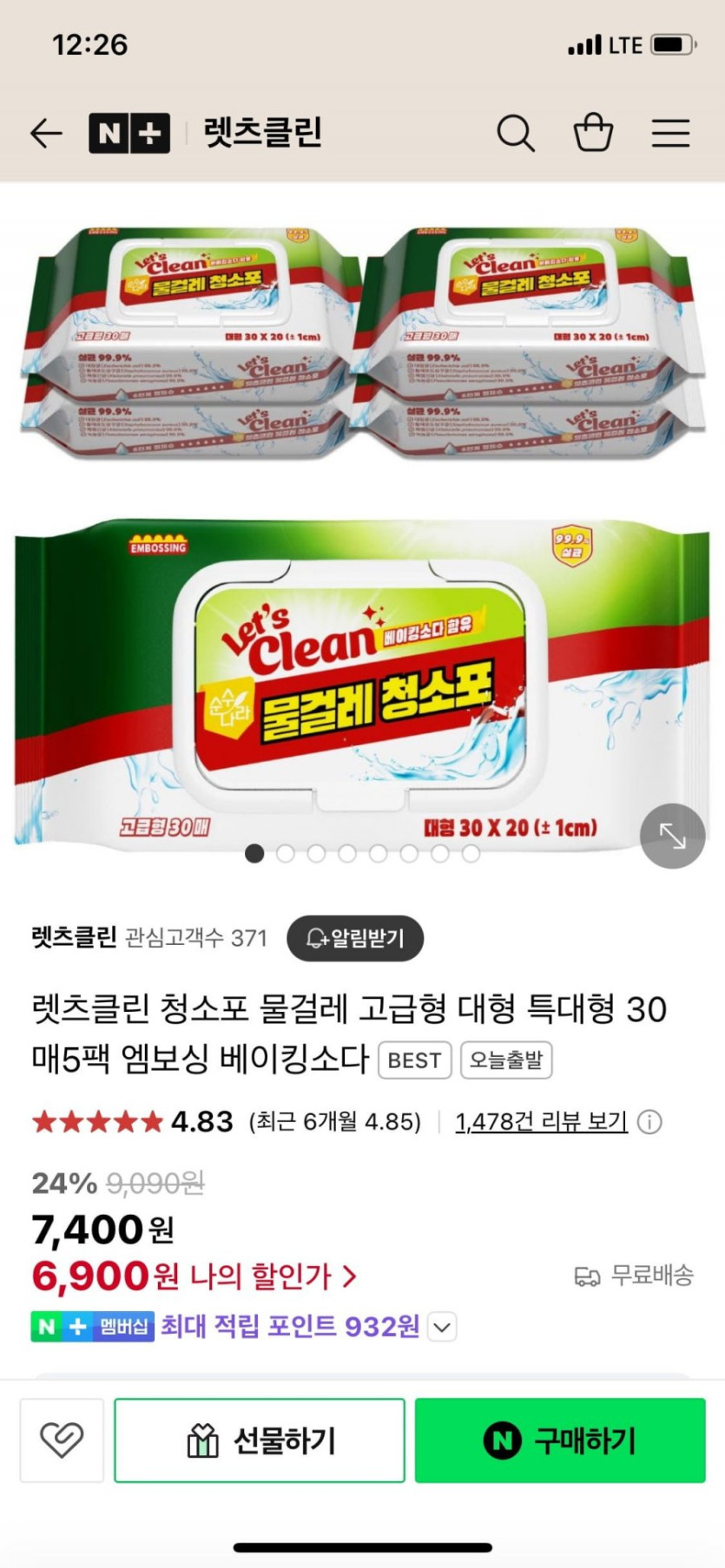 [네이버]렛츠클린 물걸레 청소포 대형 30매 5팩 (6900원/무배)