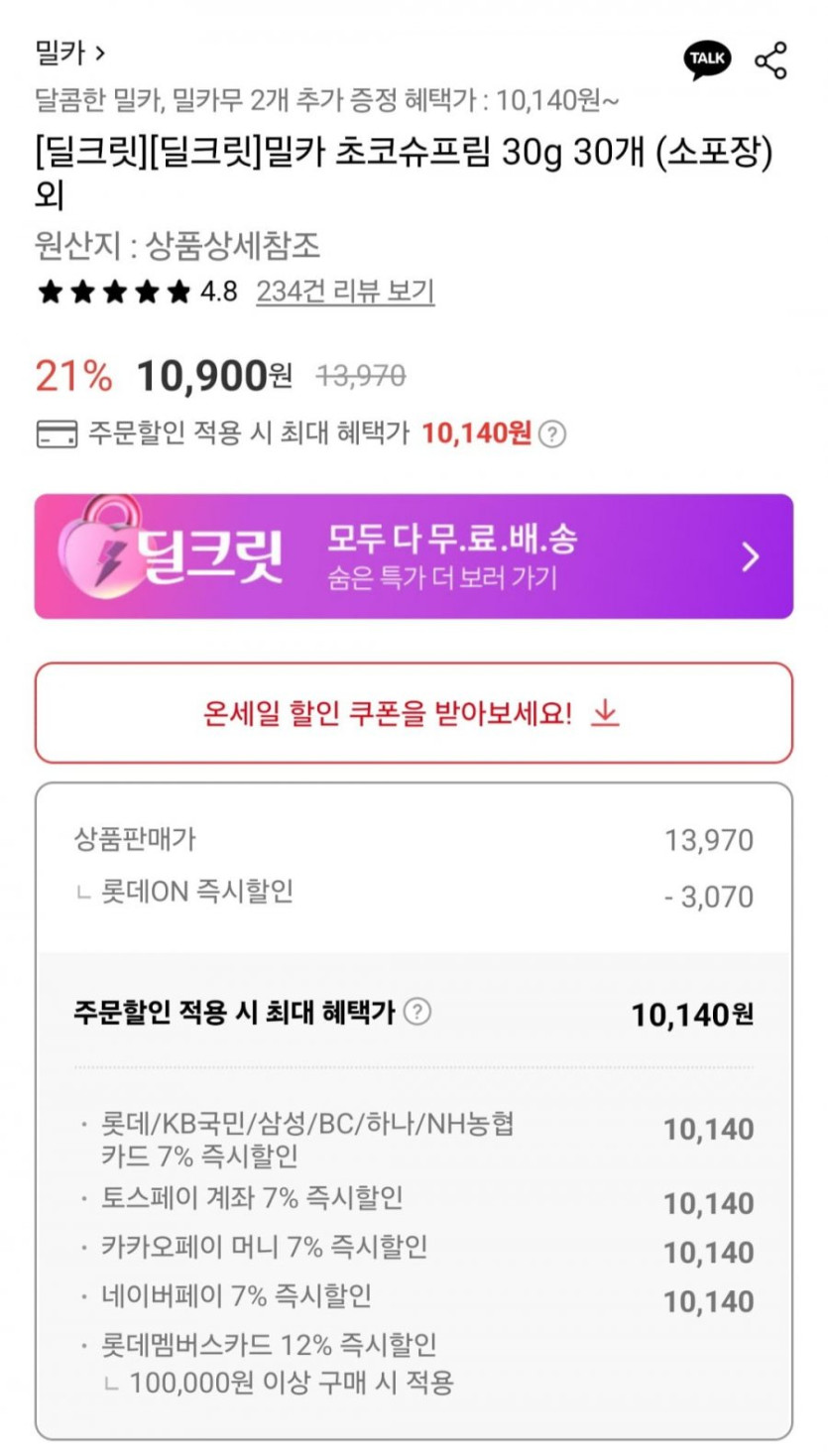 [롯데온]밀카 초코슈프림 30g 30개 (카드시10,140원/무료)