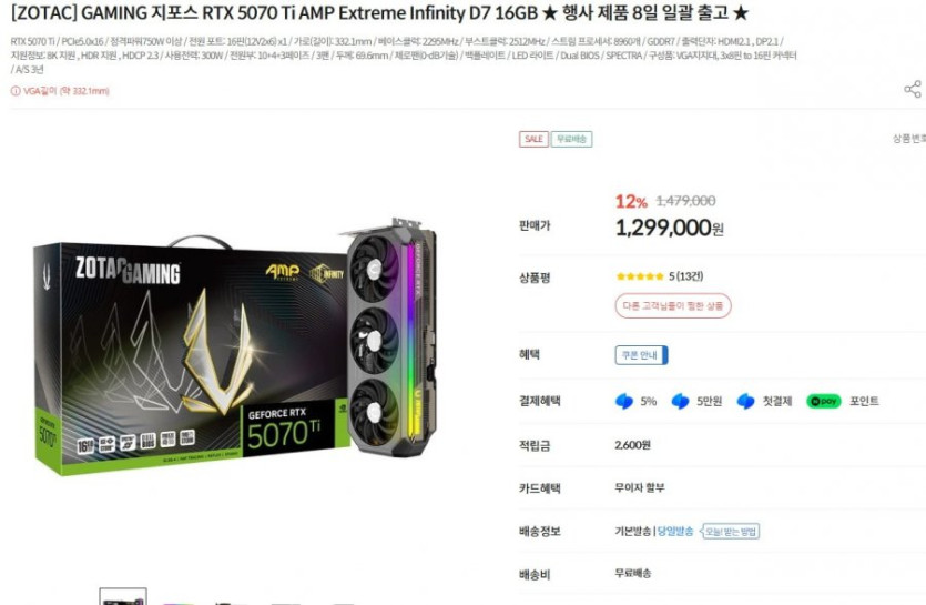 [컴퓨존]ZOTAC RTX 5070 Ti AMP Infinity (1,299,000원/무배)