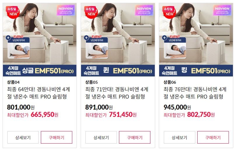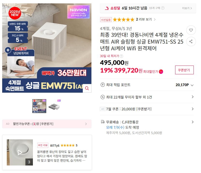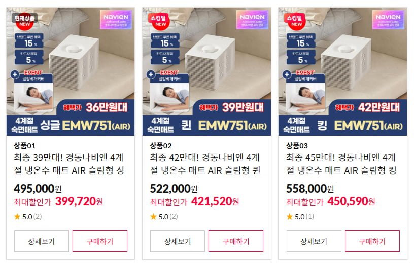 [11번가]경동나비엔 4계절 냉온수 매트 AIR 슬림형 싱글 EMW751-SS 25년형(399,720원/무료)