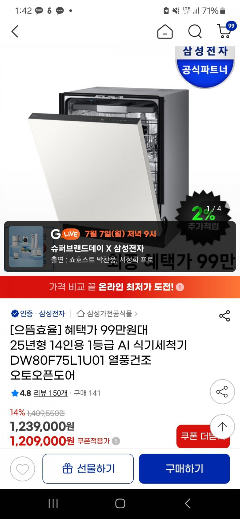 [지마켓]삼성 25년형 14인용 1등급 AI 식기세척기 DW80F75L1U01 열풍건조 (1,209,000/무료)