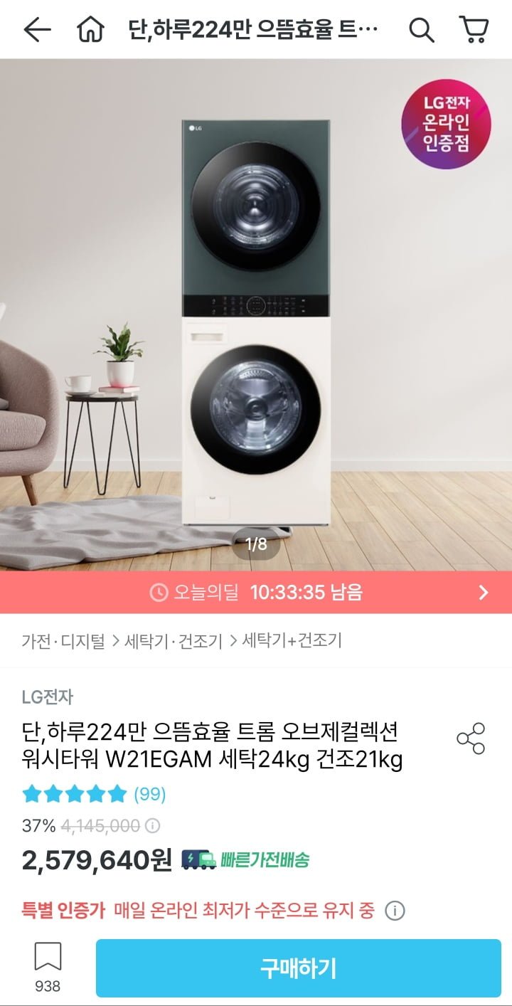 [오늘의집]Lg 트롬 오브제컬렉션 워시타워 세탁24kg 건조21kg (체감가 224만원대) (카드 2,499,640원/무료)