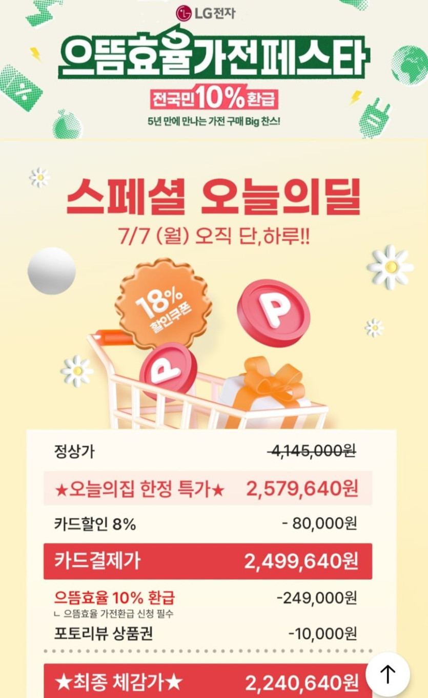 으뜸효율 10%환급 + 포토리뷰상품권 받으면 224만원대 입니다