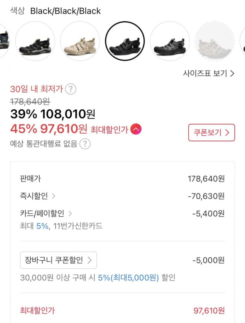 + 11번가 신카 할인 적용하면 블랙/사이즈9 기준으로