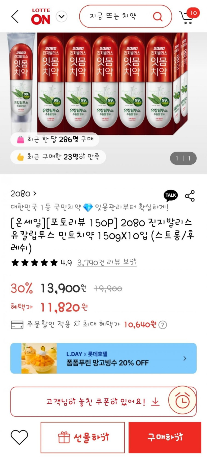 [롯데온]2080 진지발리스 유칼립투스 민트치약 150gX10입 (스트롱/후레쉬) (카드 10% 적용시 10,640원/무배)