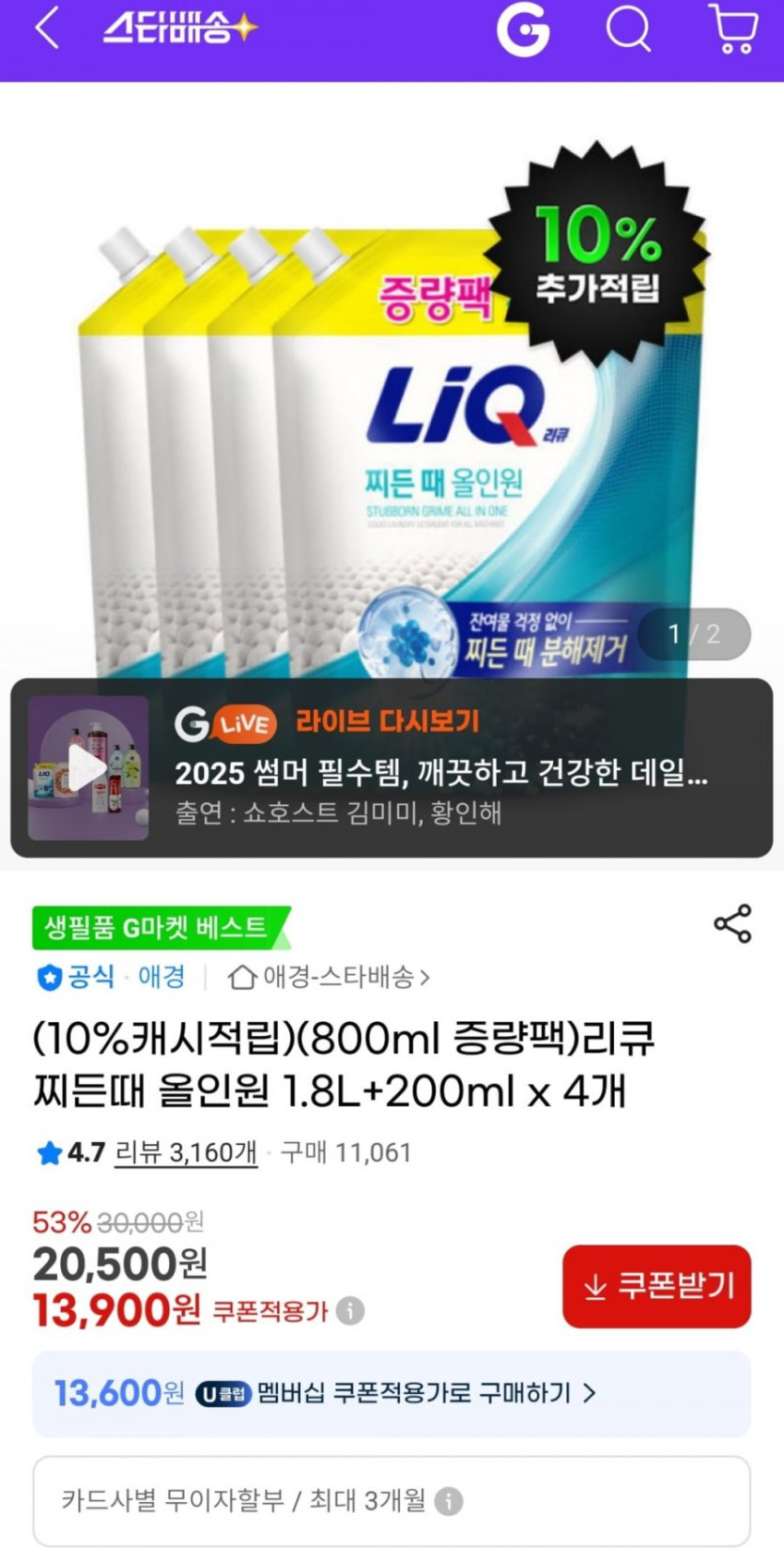 [G마켓]리큐 찌든때 올인원 증량팩 1.8L + 200ml 4개 (유클 13,600원 / 무료)