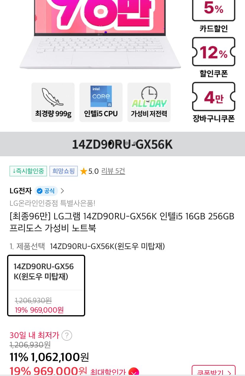 [11번가]LG그램 14ZD90RU-GX56K (969,000원/무료)