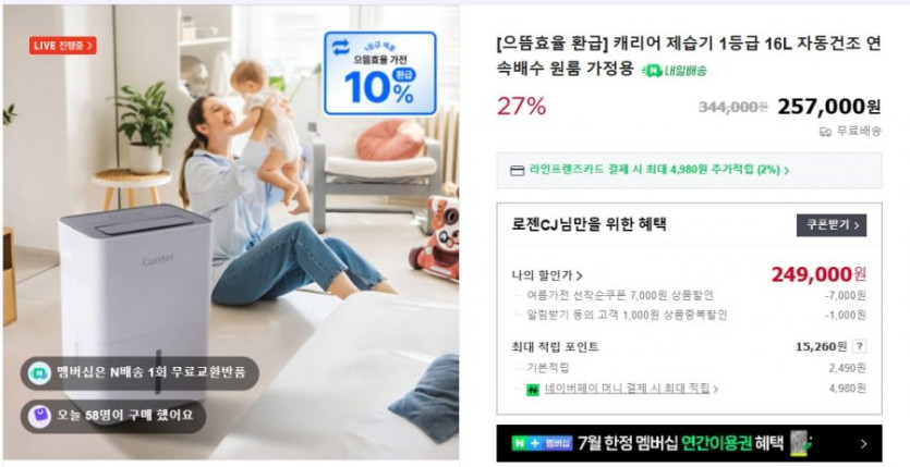 [네이버]캐리어 16L CDHC-160AYLLOYH (249,000원/ 무료)