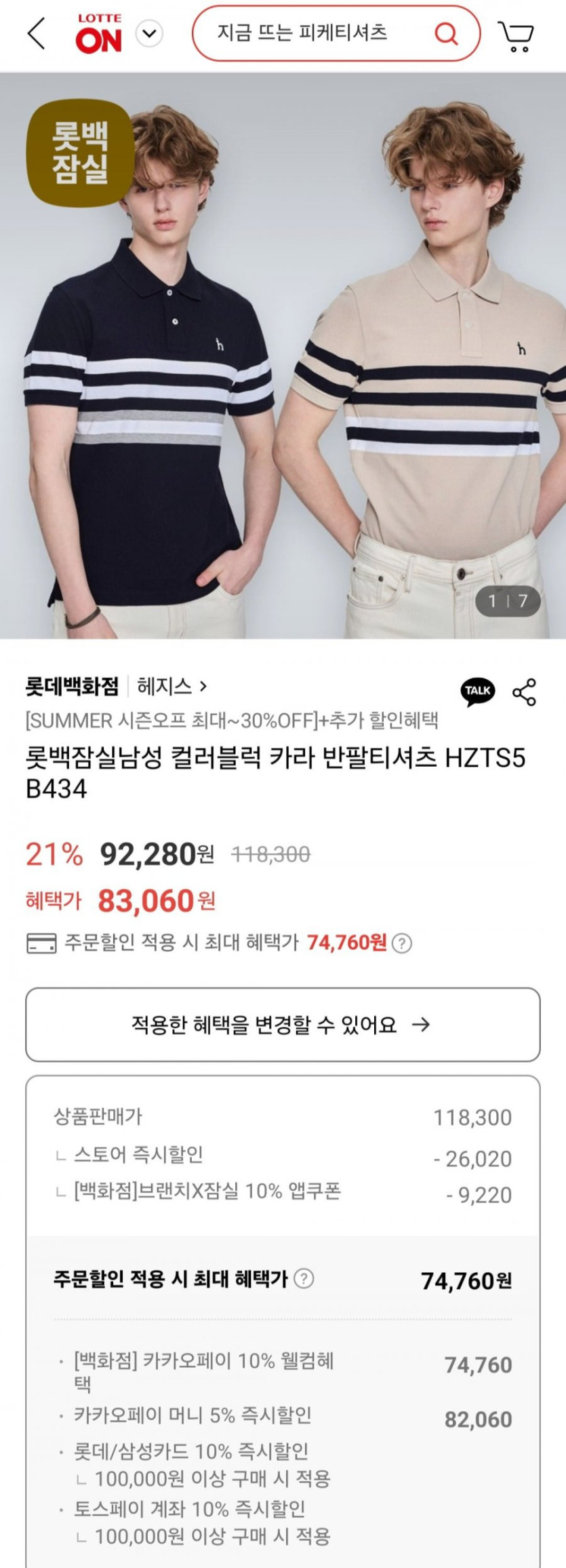 [롯데온]헤지스 남성 카라 반팔티셔츠 (74,760원/무료)