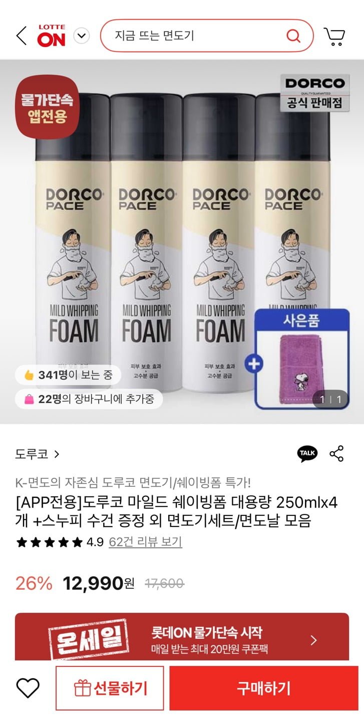 [롯데온]도루코 페이스 쿨 크러쉬 쉐이빙폼 대용량 250ml 4개 (12,990원/무료)