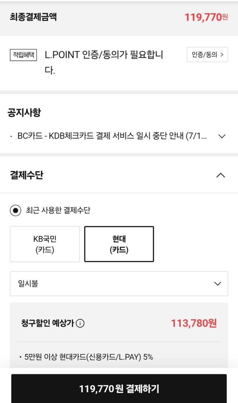 아래 네이버 경유로 들어가서 롯데홈쇼핑 쿠폰 15% 적용하면 119,770원이고