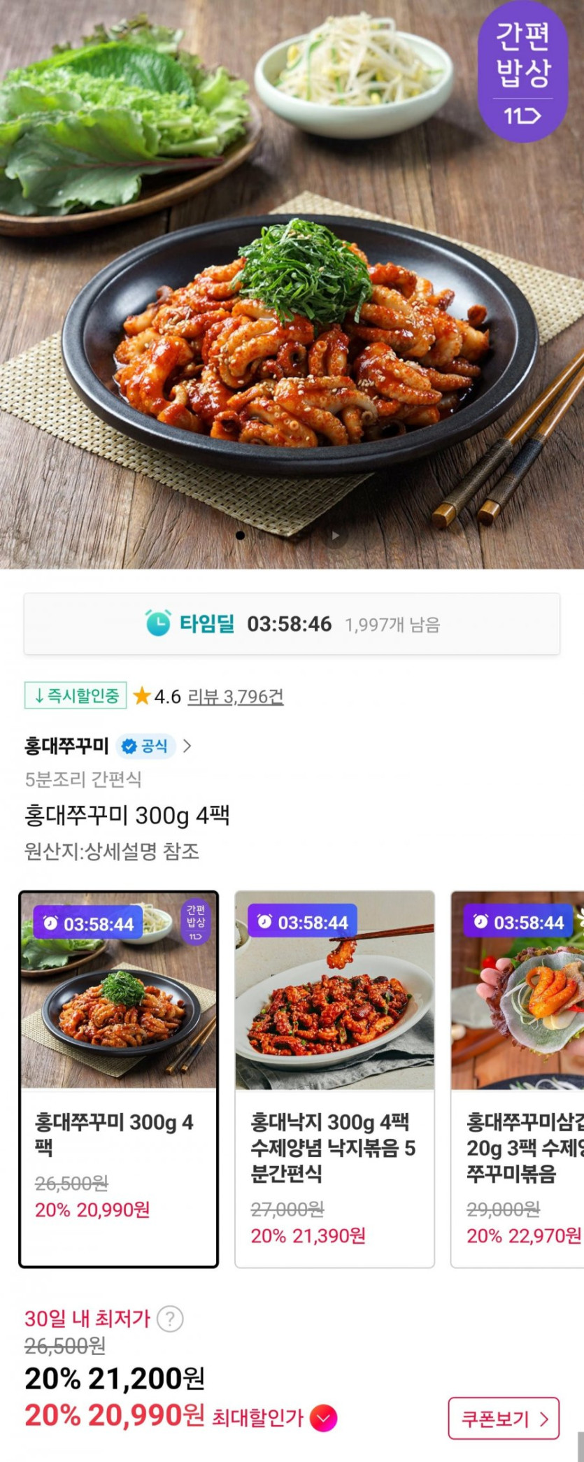 [11번가]홍대쭈꾸미 300g 4팩 + 치즈사리 (20,990원/무료)