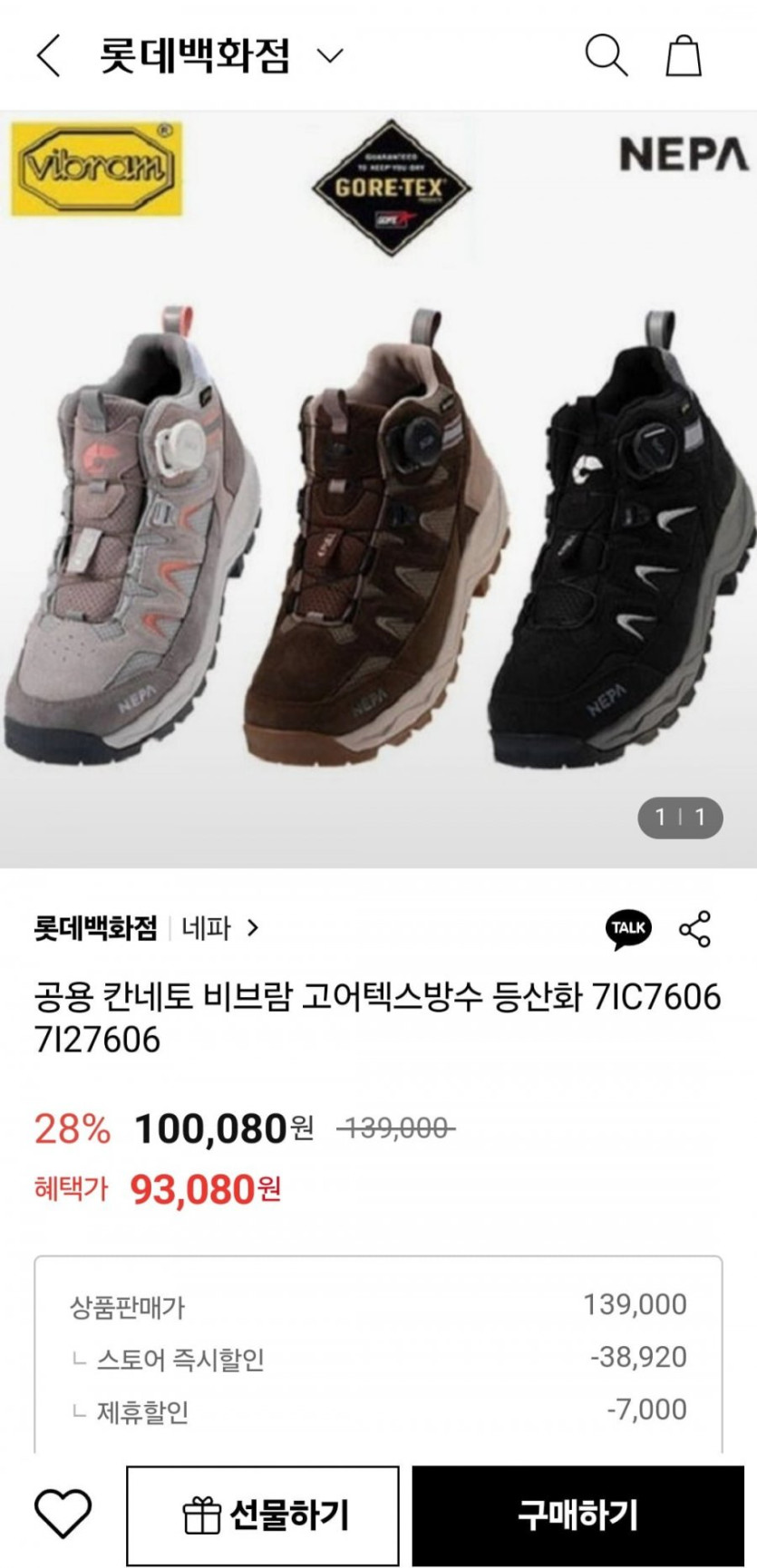 [롯데온]네파 남여 칸네토보아 비브람 고어텍스방수 등산화(93,080원/무배)