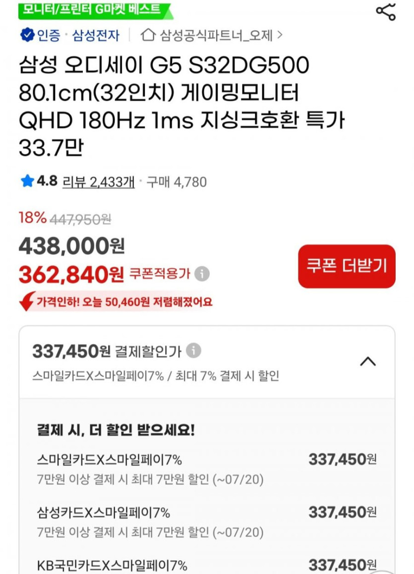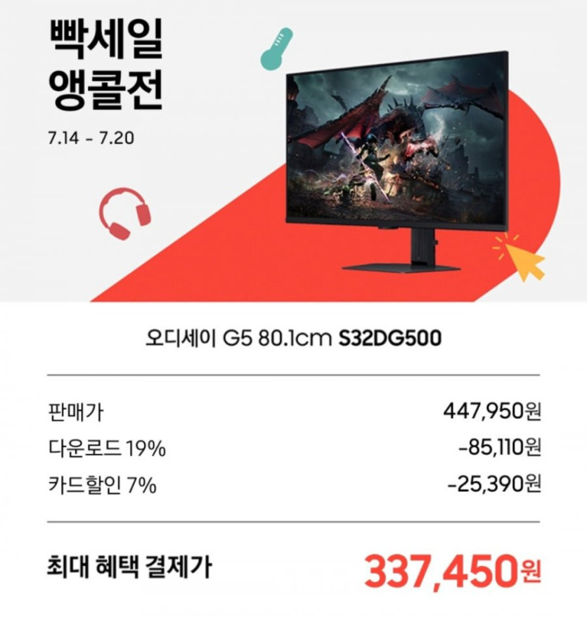[지마켓]삼성오디세이 G5 S32DG500 32인치 (80.1cm) 게이밍모니터 180헤르츠 1ms (362,840원/무료)