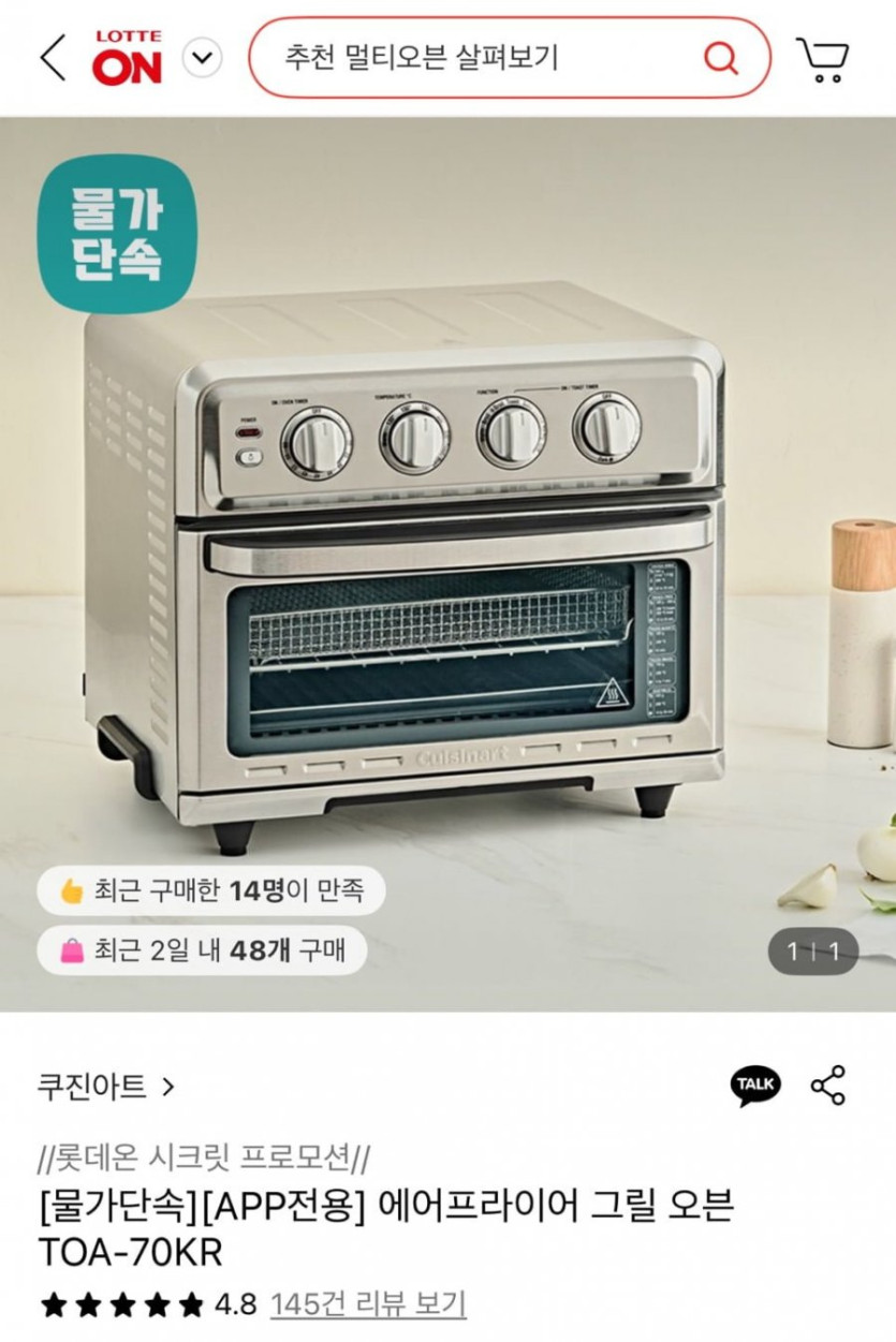 [롯데온]쿠진아트 에어프라이어 그릴 오븐 17L TOA-70KR (185,930원/무료)