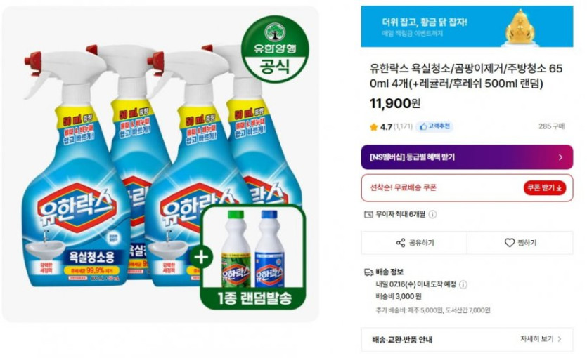 [NS홈쇼핑]유한락스 욕실청소/곰팡이제거/주방청소 650ml 4개+레귤러/후레쉬 500ml 랜덤증정(11,900원/배송비지원)