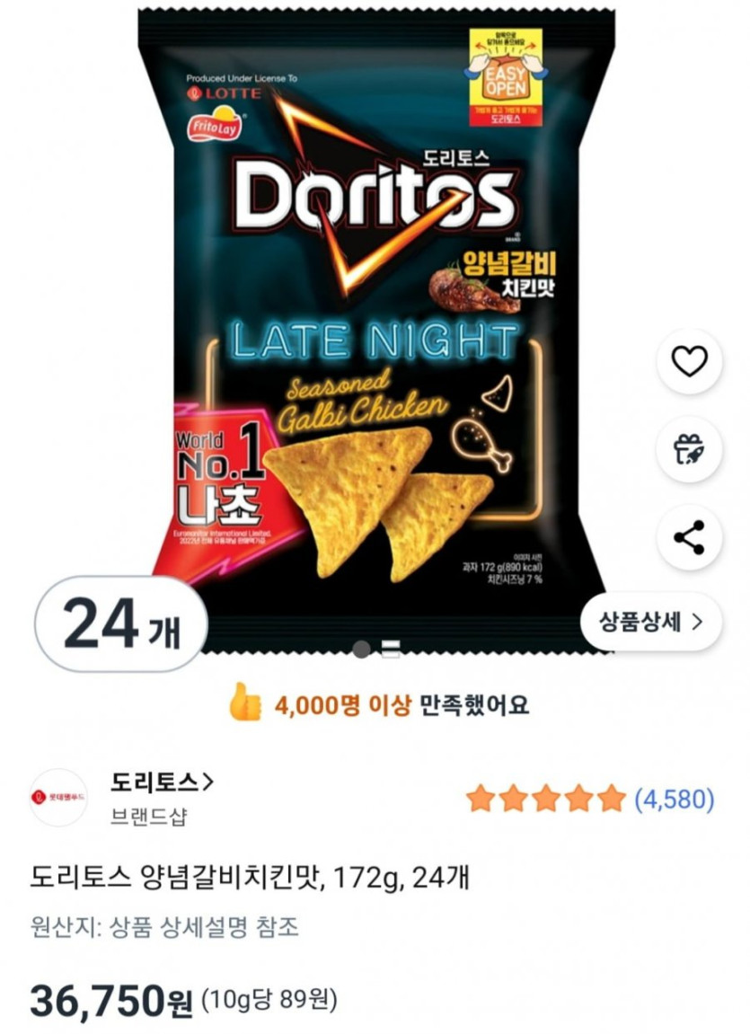 [쿠팡]도리토스 양념갈비치킨맛, 172g, 24개 (36,750원/무료)
