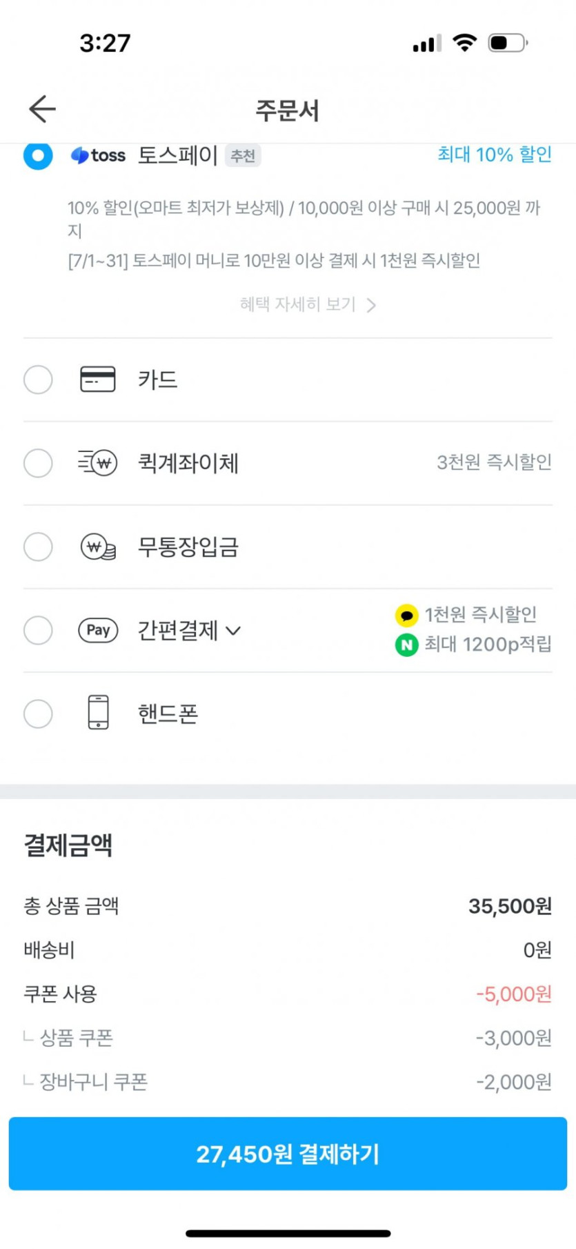 상품쿠폰+장바구니쿠폰+토스페이 결제 시 27,450원