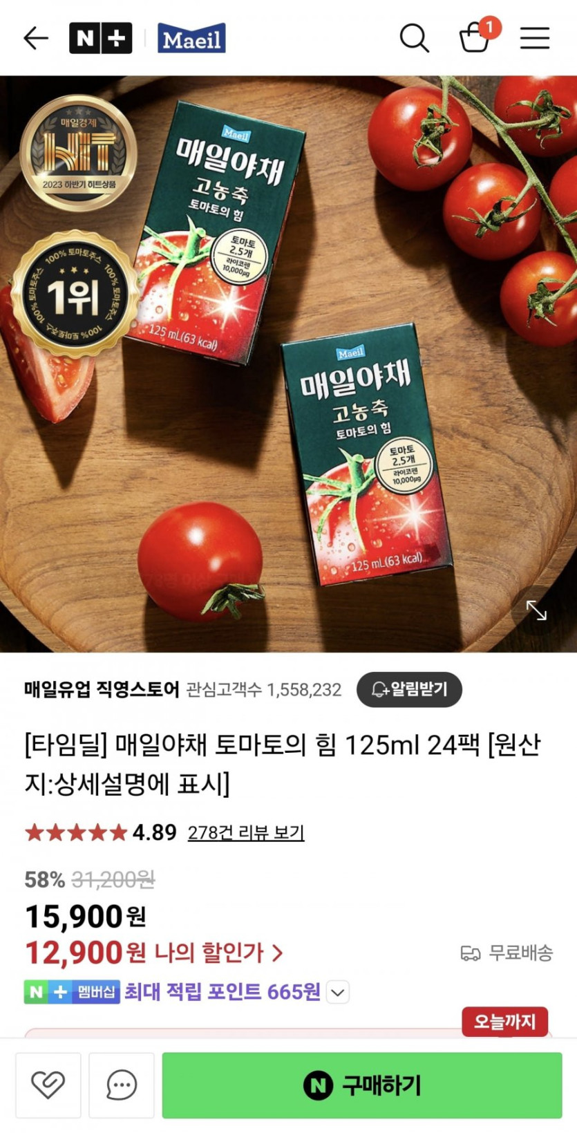 [네이버]매일야채 토마토의 힘 125ml 24팩 (12,900원/무료) 작성자 정보 초코 작성 작성일 2025.07.17 00:08 컨텐츠 정보 106 조회 목록 본문 아침대용으로 간단히 먹기 좋네요3천원 쿠폰받으면 가격 나오고 팩당 537원 입니다https://brand.naver.com/maeil/products/9248484343 관련자료 이전 [옥션]항공직송 미국산 생체리 1kg 9.5row (유클 14,310원/무료) 작성일 2025.07.17 00:09 다음 [쿠팡]오리온 도도한 나쵸 치즈맛 92g 8개 (8,850원/무료) 작성일 -0001.11.30 00:00 댓글 0 등록된 댓글이 없습니다. 로그인한 회원만 댓글 등록이 가능합니다. 목록