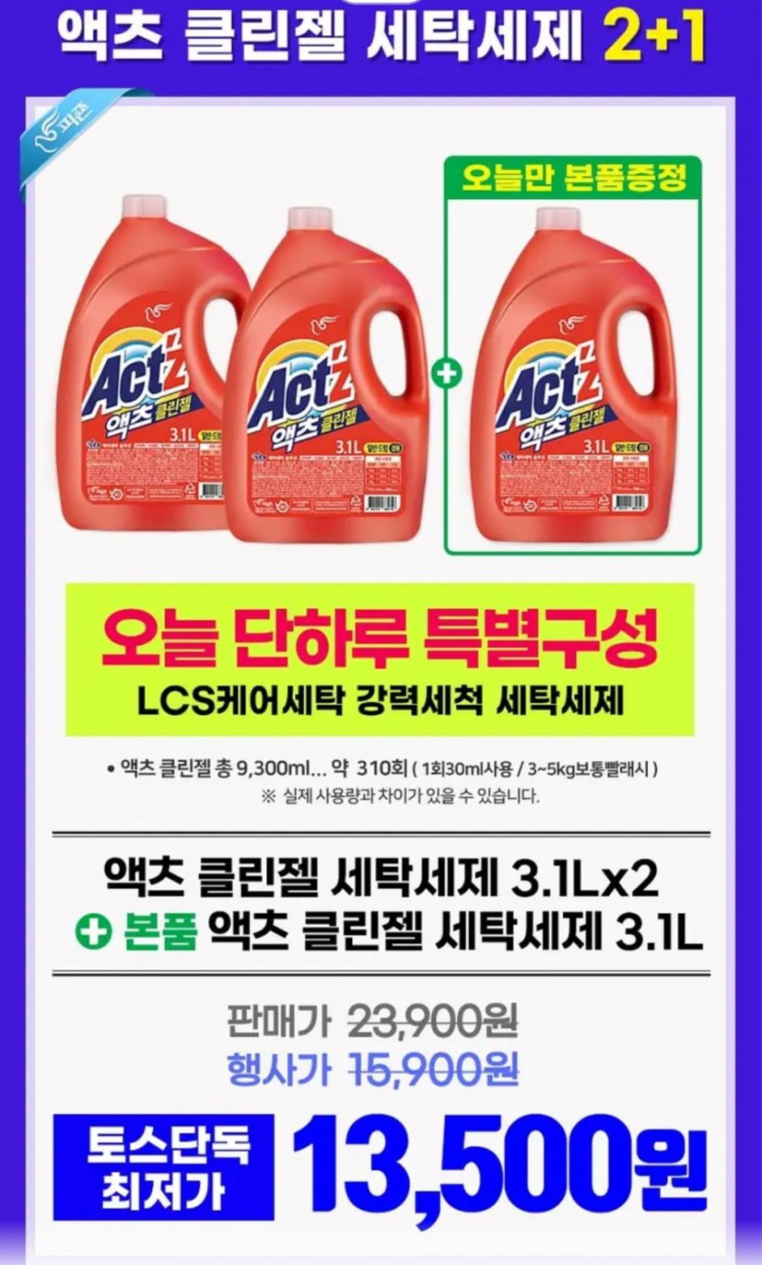 [토스쇼핑]액츠 클린젤 세탁세제 3.1Lx2 + 3.1L추가 (13,500원/무료)