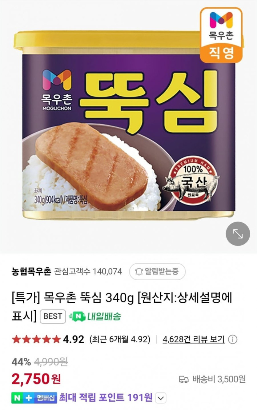 [네이버](멤버십) 목우촌 뚝심 340g 3캔 (7,420원/멤버십무배)