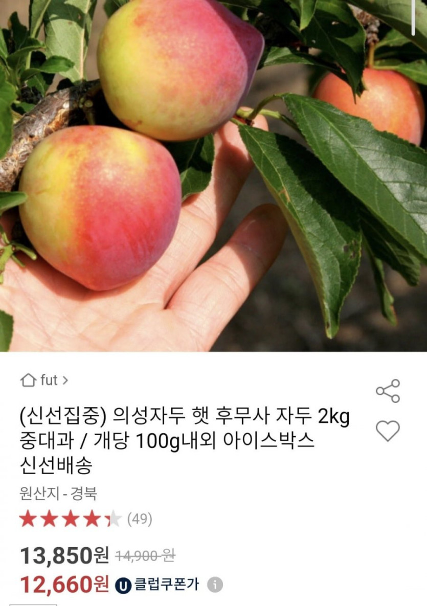 [옥션]의성 햇 후무사 자두2kg 중대과 (유클12,660원/무료)