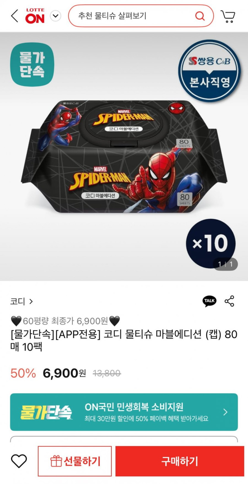 [롯데온]코디 물티슈 마블에디션 (캡) 80매 10팩 (6,900원/무료)