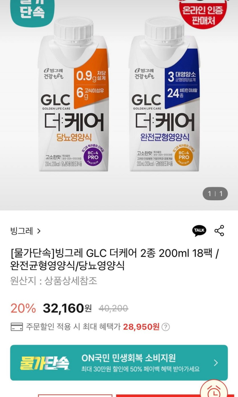 [롯데온]빙그레 GLC 더케어 2종 200ml x18팩(28,950원/무배)