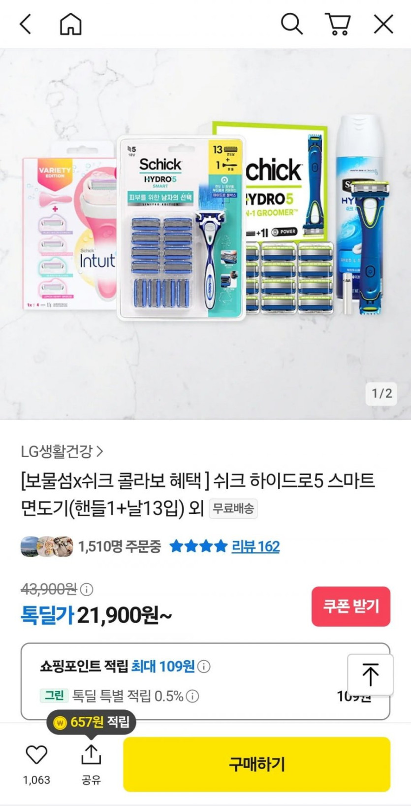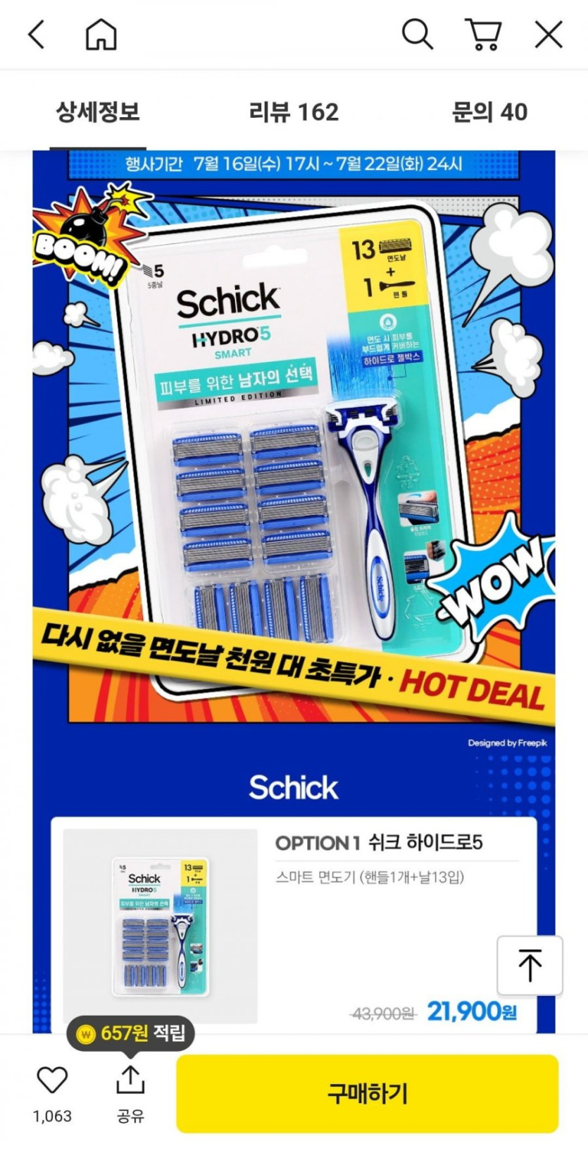쉬크 스마트 면도기 날 13개 21,900원 입니다 옵션에 쉐이빙폼 3개도 9,900원 있습니다 필요하신분 보세요