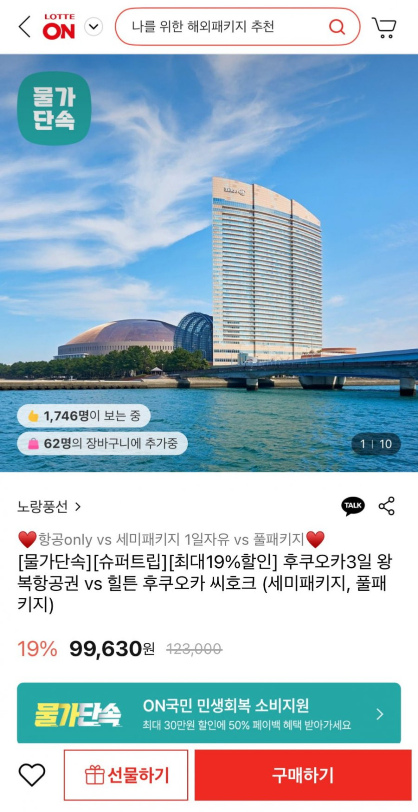 [롯데온]후쿠오카3일 왕복항공권 성인&소아 동일가 (99,630원/무료)